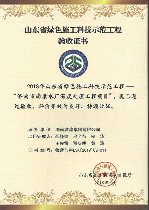 濟(jì)南市南康水廠深度處理工程項(xiàng)目被評為2018年山東省綠色施工科技示范工程