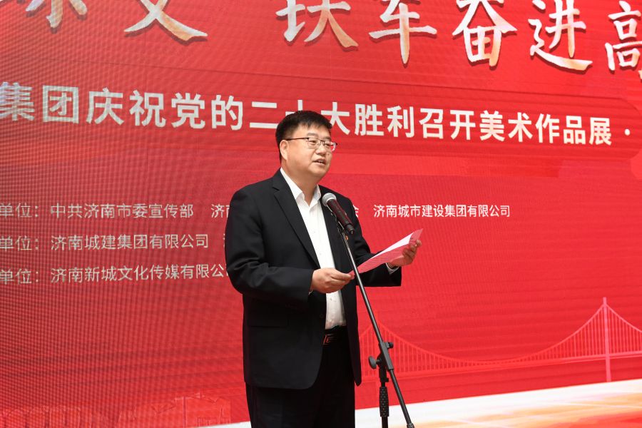 10月20日上午,由中共濟南市委宣傳部、濟南市文學(xué)藝術(shù)界聯(lián)合會、濟南城市建設(shè)集團有限公司主辦,濟南城建集團有限公司、濟南市美術(shù)家協(xié)會承辦的“省會十年蝶變 鐵軍奮進高歌——濟南城市建設(shè)集團慶祝黨的二十大勝利召開美術(shù)作品展”在集團大成美術(shù)館開幕。濟南市委副書記楊峰出席開幕式并講話。人民日報社山東分社社長徐錦庚,市委原常委、秘書長蔣曉光,市人大常委會副主任黃貴利,市委宣傳部分管日常工作的副部長、市文明辦主任孫世會,市委副秘書長謝金嶺,中國美術(shù)家協(xié)會理事、山東省美術(shù)家協(xié)會常務(wù)副主席張宜,市文聯(lián)黨組書記、副主席劉浩,市國資委黨委書記、主任張海平;建設(shè)集團黨委書記、董事長史海成,黨委副書記鐘善良,黨委委員、紀(jì)委書記、監(jiān)察專員劉學(xué)謙出席活動。活動由集團黨委書記、董事長、總經(jīng)理牟曉巖主持。