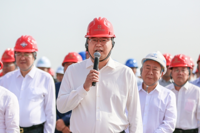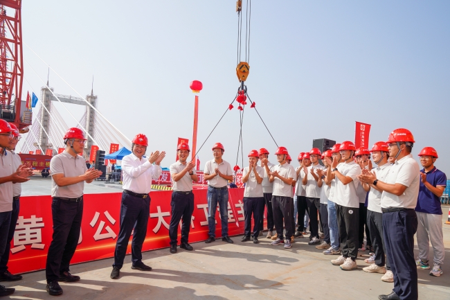 建設集團黨委書記、董事長史海成宣布G104京嵐線濟南黃河公路大橋主橋合龍。